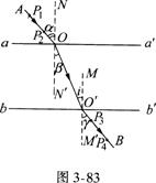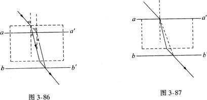 例4.某同学用插针法测定玻璃砖的折射率,他的实验方法和操作步骤正确无误。但他处理实验记录时发现玻璃砖的两个光学面aa’与bb’不平行,如图3-83所示。则: