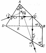 图中δ为所求的偏向角,从图中几何关系可知ΔNFM和ΔNGH有两个角相等,所以第三个角一定相等,所以∠FMN=∠FGH=90° δ=90°