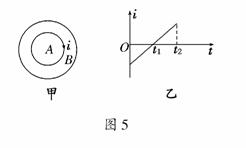 4.(2010·填江模拟)如图5甲所示,两个闭合圆形线圈A、B的圆心重合,放在同一水平面内,线圈A中通以如图5乙所示的变化电流,t=0时电流方向为顺时针(如图中箭头所示).在t1-t2时间内,对于线圈B,下列说法中正确的是 ( )