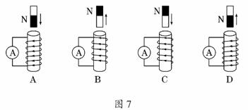 如图7所示是验证楞次定律实验的示意图,竖直放置的线圈固定不动,将磁铁从线圈上方插入或拔出,线圈和电流表构成的闭合回路中就会产生感应电流.各图中分别标出了磁铁的极性、磁铁相对线圈的运动方向以及线圈中产生的感应电流的方向等情况,其中正确的是 ( )