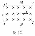 (14分)如图12所示,固定于水平面上的金属架CDEF处在竖直向下的匀强磁场中,金属棒MN沿框架以速度v向右做匀速运动.t=0时,磁感应强度为B0,此时MN到达的位置使MDEN构成一个边长为l的正方形.为使MN棒中不产生感应电流,从t=0开始,磁感应强度B应怎样随时间t变化?请推导出这种情况下B与t的关系式.