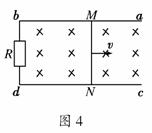 4.如图4所示,两根相距为l的平行直导轨ab、cd,b、d间连有一固定电阻R,导轨电阻可忽略不计.MN为放在ab和cd上的一导体杆,与ab垂直,其电阻也为R.整个装置处于匀强磁场中,磁感应强度的大小为B,方向垂直于导轨所在平面(指向图中纸面内).现对杆MN施力使它沿导轨方向以速度v做匀速运动.令U表示MN两端电压的大小,则