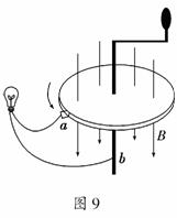 9.如图9所示是法拉第做成的世界上第一台发电机模型的原理图.将铜盘放在磁场中,让磁感线垂直穿过铜盘;图中a、b导线与铜盘的中轴线处在同一竖直平面内;转动铜盘,就可以使闭合电路获得电流.若图中铜盘半径为L,匀强磁场的磁感应强度为B,回路总电阻为R,从上往下看逆时针匀速转动铜盘的角速度为ω.则下列说法正确的是 ( )