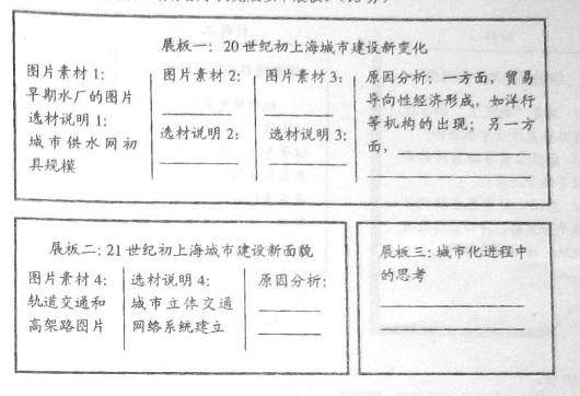 2010年世博会在上海召开,中国人百年梦圆。为体现上海城市变迁的历史,学校组织了图片展,请你按示例完成以下展板。(13分)
