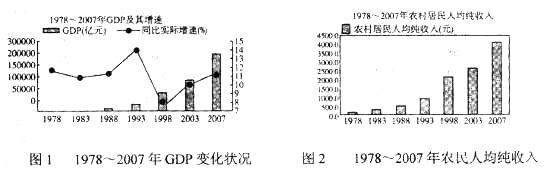 6.(2010.山东省凤城中学期中考试)识读下列关于中国经济发展的两幅图表,我们可以得出的正确结论有 ①GDP同比增速持续加快 ②综合国力大幅度地提高 ③人民生活明显得到改善 ④农民人均收入持续增长