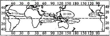 7.世界上台风发生最频繁的地区位于                                    (   )