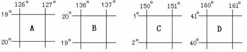 34.A、B、C、D四地,按纬度由高到低排列为           。春分日正午太阳高度角由大到小排列为