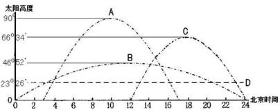 (十)下列A、B、C、D四条曲线表示不同纬度在6月22日的太阳高度日变化,读图回答相关问题。(12分)