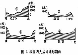 读图3“我国四大盆地地形剖面图”完成5-6题。