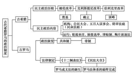 高考是对知识的综合考查,因此在复习中不能仅限于复习某个知识点,而应该纵横联系,前后贯通,构建“网状”知识体系。织“网”就是把零散的知识串联起来,“织”成完整的、立体的网,实现学科内的“超级链接”。下面以古代希腊罗马的政治制度为例进行展示: