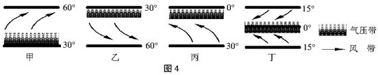 甲、乙、丙、丁四图所反映的全球气压带、风带分布状况中,与我国梅雨季节相对应的是 ( )