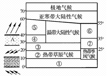 (3)上图中,气候类型⑦的成因是 ;图中显示的季节里,④地区气候的特点是 ;气候类型⑤分布的一般规律是