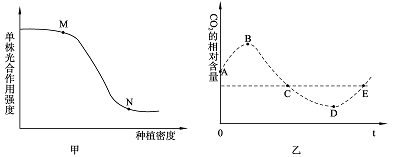 实验一:探究单株番茄光合作用强度与种植密度的关系,结果如甲图所示。与M点相比,N点限制单株光合作用强度的外界因素是 、 。实验还发现,不仅单株番茄光合作用强度与种植密度呈负相关关系,番茄植株的生长也与种植密度呈负相关,番茄生长的调节方式是 ,与番茄果实发育关系最密切的是 ,环境温度降低时,该物质运输速度会 。