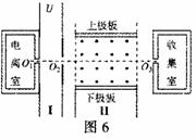 如图6所示,一束纳米粒子(不计重力,初速度可忽略)缓慢通过小孔O1进入极板间电压为U的水平加速电场区域I,再通过小孔O2射入相互正交的恒定匀强电场、磁场区域II,其中磁场的方向如图,磁感应强度大小可根据实际要求调节,收集室的小孔O3与O1、O2在同一条水平线上.