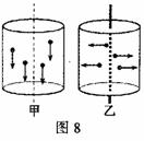 10.为模拟净化空气过程,有人设计了如图8所示的含有灰尘空气的密闭玻璃圆柱桶(圆桶的高和直径相等)。第一种除尘方式是:在圆柱桶顶面和底面间加上电压U,沿圆柱桶的轴线方向形成一个匀强电场,尘粒运动方向如图甲所示;第二种除尘方式是:圆柱桶轴线处放一直导线,在导线与容器壁间加上的电压也等于U,形成沿半径方向的辐向电场,尘粒运动方向如图乙所示。已知空气阻力与尘粒运动的速度成正比,即f=kv(k为一定值),假设每个尘粒的质量和电量均相同,重力可忽略不计,则在这两种方式中