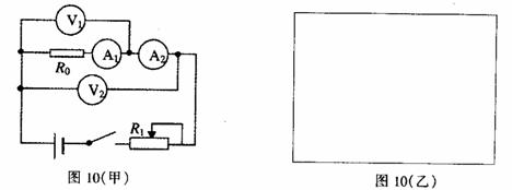 (1)为了测量定值电阻的阻值及两表的内阻,某同学设计了如图10(甲)所示的电路。在某次测量中电压V1、V2的示数分别为1.20V、1.45V ;电流表A1、A2的示数为48.0mA、50.0mA,则定值电阻的阻值R0= Ω;电流表的内阻RA= Ω;电压表的内阻RV= Ω.