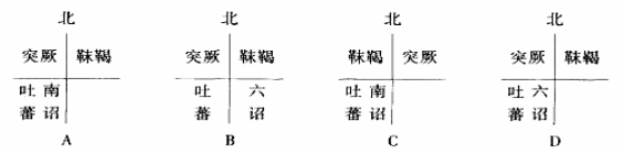 28、(2009.贵州省遵义市一中联考)唐太宗说:“中国百姓,天下之根本,四夷之人,犹如枝叶。”当时的“四夷”及其方位正确的图示是 ( )