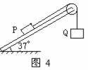 .如图4,物体P、Q用轻绳连接后跨过定滑轮,物体P静止在倾角为37°角的斜放木板上,Q悬挂着.已知P、Q的质量mP 、mQ 大小的关系为mQ = 3 mP/4 .今将斜放木板的倾角从37°增到45°,物体P仍保持静止而没有滑动,若不计滑轮处的摩擦,则下列说法中正确的是: