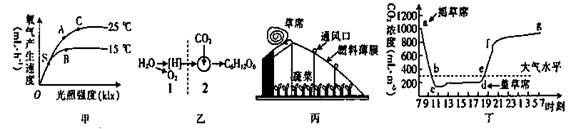 下列图示中甲、乙显示植物光合作用强度与环境因素之间的关系和相关生理过程:丙、丁表示种植蔬菜的大棚剖面图(棚顶的草席是用草制成的覆盖物)和一天中大棚内CO2浓度变化的曲线,其中在c-d期间打开大棚通风口。请根据图中信息回答: