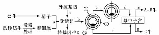 (每空1分,共10分)以下是科学家采用不同方法培育良种牛的过程,a~h为操作过程。请据图回答有关问题: