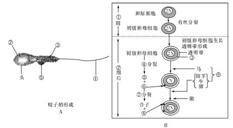 44.(10分)下图A为成熟精子的结构示意图,图B是家畜卵子发生和成熟过程示意图,请据图回答下列问题([ ]内填图中序号)