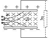 解:由左手定则,正、负离子受的洛伦兹力分别向上、向下。所以上极板为正。正、负极板间会产生电场。当刚进入的正负离子受的洛伦兹力与电场力等值反向时,达到最大电压:U=Bdv。当外电路断开时,这也就是电动势E。当外电路接通时,极板上的电荷量减小,板间场强减小,洛伦兹力将大于电场力,进入的正负离子又将发生偏转。这时电动势仍是E=Bdv,但路端电压将小于Bdv。