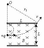 粒子擦着上板从左边穿出时,圆心在O'点,有r2=L/4,又由r2=mv2/Bq=L/4得v2=BqL/4m