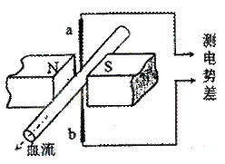 (09宁夏卷)16. 医生做某些特殊手术时,利用电磁血流计来监测通过动脉的血流速度。电磁血流计由一对电极a和b以及磁极N和S构成,磁极间的磁场是均匀的。使用时,两电极a、b均与血管壁接触,两触点的连线、磁场方向和血流速度方向两两垂直,如图所示。由于血液中的正负离子随血流一起在磁场中运动,电极a、b之间会有微小电势差。在达到平衡时,血管内部的电场可看作是匀强电场,血液中的离子所受的电场力和磁场力的合力为零。在某次监测中,两触点的距离为3.0mm,血管壁的厚度可忽略,两触点间的电势差为160µV,磁感应强度的大小为0.040T。则血流速度的近似值和电极a、b的正负为
