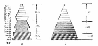 下图为甲、乙两个地区的人口年龄组成示意图。若甲地区的人口增长率为a,乙地区的人口增长率为b,那么a与b的数量关系是