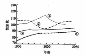 人口的性别结构是指一个国家或地区两性人口数量的比例关系,它通常由性别比这个指标加以度量,性别比为平均每100名女性所对应的男性人口的数量,下图为四条人口性别比例曲线,回答2题