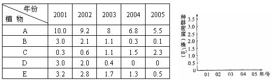 (1)在所调查的A-E五种植物中,你认为入侵物种是 ,请在坐标图中绘出该物种的种群密度变化曲线。