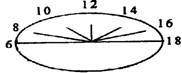 右下图为某学生自制的刻有终点时间的圆盘,中心垂直插上一根高为10厘米的标杆,7条放射状线是该生在某日每隔2小时记录的标杆阴影的长度。正午时标杆影长10厘米,以下说法错误的是: