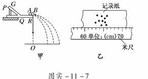 4.某同学用图实-11-7甲所示的装置通过半径相同的A、B两球(mA>mB)的碰撞来验证动量守恒定律.图中PQ是斜槽,QR为水平槽.实验时先使A球从斜槽上某一固定位置G由静止开始滚下,落到位于水平地面的记录纸上,留下痕迹.重复上述操作10次,得到10个落点痕迹.再把B球放在水平槽上靠近槽末端的地方,让A球仍从位置G由静止开始滚下,和B球碰撞后,A、B球分别在记录纸上留下各自的落点痕迹.重复这种操作10次.图甲中O点是水平槽末端R在记录纸上的垂直投影点.B球落点痕迹如图乙所示,其中米尺水平放置,且平行于G、R、O所在的平面,米尺的零点与O点对齐.