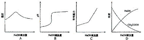 解析:A选项氢氧化钠和醋酸发生中和反应,反应放热,当酸反应完成后,再加碱,相当于往热水中加入冷水,温度降低。B选项醋酸中滴加氢氧化钠酸性减弱pH增大。C选项醋酸中滴加氢氧化钠,相当于弱电解质溶液变成强电解质溶液,因此导电能力增加。D选项醋酸中滴加氢氧化钠,氢氧化钠和醋酸发生反应了,因此氢氧化钠开始时为0.
