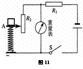 20、某校物理兴趣小组设计了一种“电子秤”,实际上是压力测量仪,用它来称量物体的重量,其原理结构如图11所示.图中A为金属片,B为金属板,R1=24Ω, R2是最大值为72Ω的滑动变阻器,电源电压为12V不变.则图中重量表应该用 (电流表/电压表);当称量物体重量达到最大值时,R2两端的电压为 V.