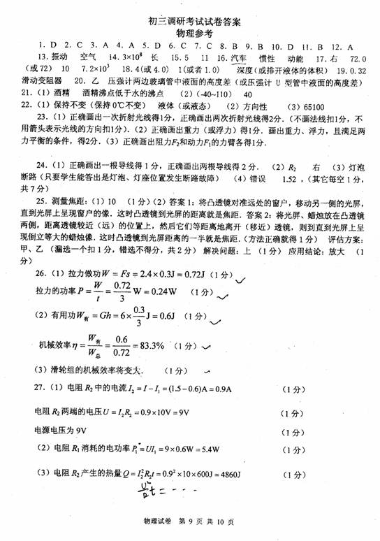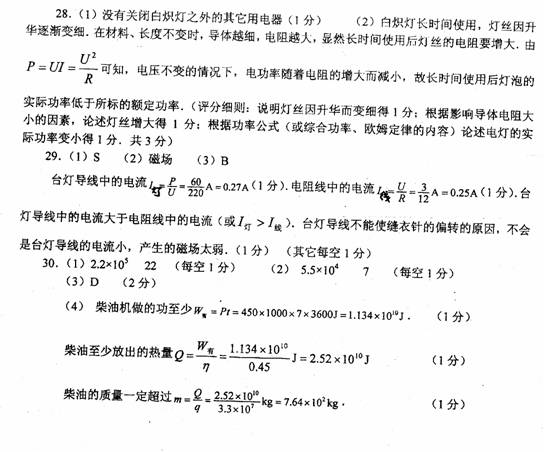 28.(4分)小明为了弄清楚“用久了的白炽灯发光变暗”的原因,他将家里一盏标有“220V 40W”的旧白炽灯打开后,跑到楼道里观察电能表,并用手表配合测出用电功率为1200W.
