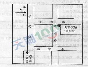 下面是某地海韵宾馆的位置示意图,如果在汽车站有位老同志向你打听去海韵宾馆的路,你该怎样向他介绍呢?请根据下图提示,用简明、连贯、得体的语言表达出来。(4分)
