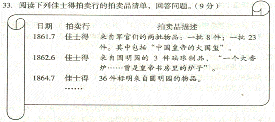 (1)上述拍卖品是在哪一次战争中被哪些国家劫掠的?