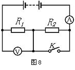 例三、在如图8所示的电路中,将开关K闭合,则电流表的示数