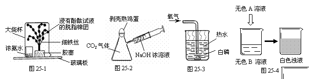 道具如图25-1所示,该魔术中可观察到“铁树”上浸有无色酚酞试液的棉团由白色变为 ▲ 色。该魔术中没有涉及的性质是 ▲ (填字母序号)。