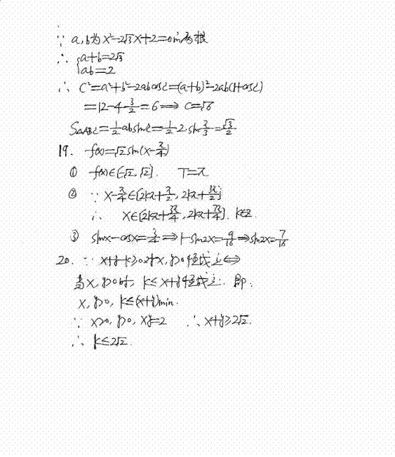 18.(本题14分)在锐角三角形中,边a、b是方程x2-2x+2=0的两根,角A、B满足:2sin(A+B)-=0,