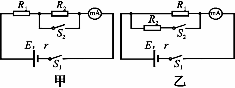 干电池(电动势约为1.5V,内阻未知),电流表(量程10mA,内阻为30-40Ω),阻值为100Ω和150Ω的定值电阻各一个,开关S1、S2,导线若干。