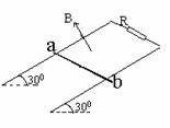 13.光滑的平行金属导轨长L=200cm,导轨宽d=10cm,它们所在的平面与水平方向成θ=300,导轨上端接一电阻R=0.8Ω的电阻,其它电阻不计,导轨放在垂直斜面向上的匀强磁场中,磁感应强度B=0.4T,有一金属棒ab的质量m=500g,放在导轨最上端,如图,当ab棒从最上端由静止开始下滑,到滑离轨道时,电阻R上放出的热量Q=1J,g=10m/s2,求棒ab下滑过程中通过电阻R的最大电流?