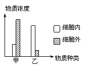 21.甲乙两种物质在细胞内外的浓度情况如右图所示。