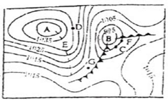 (1)根据图中字母所示的位置,填注气压场类型(低气压、低压槽、高气压、高压脊、鞍部区)A , B ,E 。