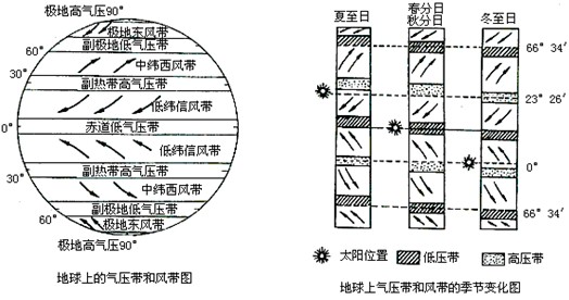 ①高低气压带相间分布,中间为风带,以赤道为轴,南北对称