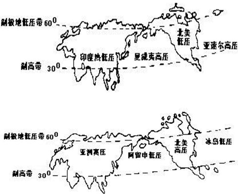·北半球气压带被陆地上的气压中心切割,断裂成块状分布