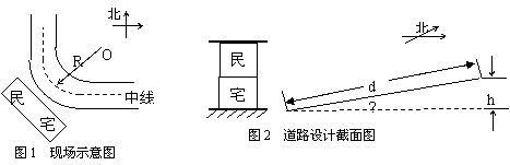 12.中央电视台《今日说法》栏目最近报道了一起发生在湖南长沙某区湘府路上的离奇交通事故。家住公路拐弯处的张先生和李先生家在三个月内连续遭遇了七次大卡车侧翻在自家门口的场面,所幸没有造成人员伤亡和财产损失,第八次则有辆卡车冲撞进李先生家,造成三死一伤和房屋严重损毁的血腥惨案。经公安部门和交通部门协力调查,画出了现场示意图(下图1)和道路的设计图(下图2)。有位交警根据图1、2作出以下判断,你认为正确的是 ( )