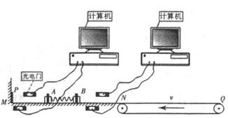 (2009山东日照模拟) 如图所示,为光电计时器的实验简易示意图。当有不透光物体从光电门问通过时,光电计时器就可以显示物体的挡光时间。光滑水平导轨MN上放置两个相同的物块A和B,左端挡板处有一弹射装置P,右端N处与水平传送带平滑连接,今将挡光效果好,宽度为d=3.6×10-3m的两块黑色磁带分别贴在物块A和和B上,且高出物块,并使高出物块部分在通过光电门时挡光。传送带水平部分的长度L=8m,沿逆时针方向以恒定速度v=6m/s匀速转动。物块A、B与传送带间的动摩擦因数p=O.2,且质量为mA=mB=l