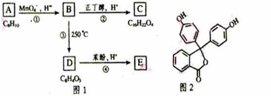 化合物A-E的转化关系如图1所示,已知:A是芳香化合物,只能生成3种一溴化合物,B有酸性,C是常用增塑剂,D是有机合成的重要中间体和常用化学试剂(D也可由其他原料催化氧化得到),E是一种常用的指示剂酚酞,结构如图2。